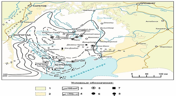 Анализ мощностей нижнеапшеронской пачки говорит, что мощности нижнеапшеронской пачки в Астраханском Прикаспии выполнены в пределах от 30 до 350 м (рис. 3). В зоне распространения солянокупольной тектоники мощности отложений сильно дифференцируемы, что свидетельствует об активизации активного соляного тектогенеза. В отдельных мульдах (в частности, в Саркызской мульде мощность отложений превышает 350 м) мощности превышают 350 м. В сводах соляных мощности нижнего апшерона мощности сокращены от 30 до 100 м. Следов полного отсутствия нижнеапшеронских отложений не наблюдается. Также в южной части, в зоне отсутствия влияния соляной тектоники, в районе Кирикилинских скважин наблюдается увеличение мощностей нижнеапшеронских отложений с более слабой дифференциацией, что свидетельствует об осадконакоплении без влияния соляной тектоники.