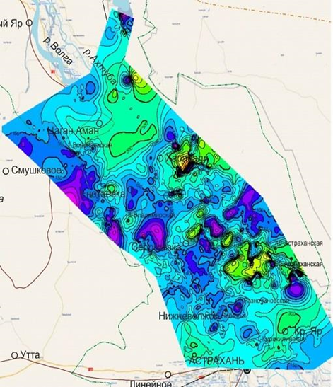 На южной части Астраханского Прикаспия, в зоне отсутствия солянокупольной тектоники, наблюдается локальные аномалии амплитудой 25–50 м, они могли быть связаны с палеорельефом. На остальной площади исследования выявленные аномалии связаны в большей степени с соляной тектоникой.