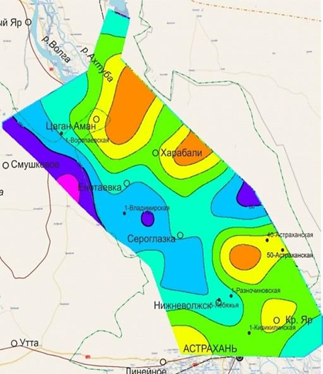 На схеме трендовых значений мощности нижнеапшеронских отложений можно выделить две крупные положительные аномалии. Первая расположена в южной и юго-восточной части Астраханского Прикаспия (Кирикилинские, Тинакские, Астраханские скважины).