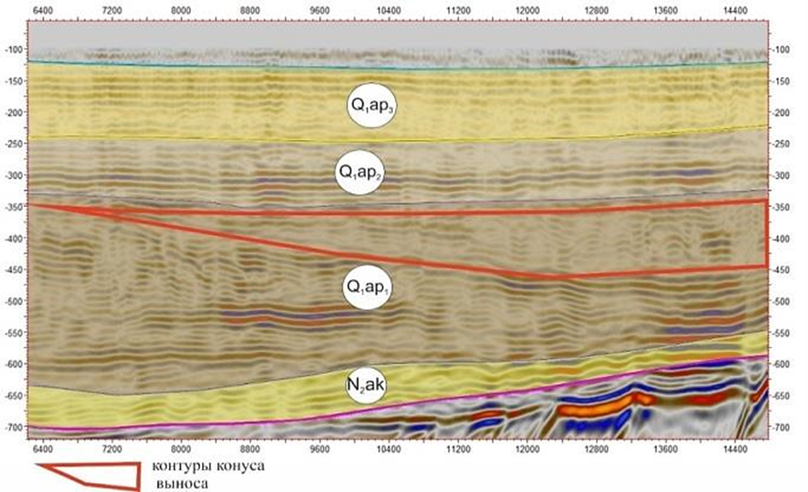 Рис. 5. Пример сейсмической записи конусов выноса в нижнеапшеронских отложениях (Тамбовская площадь)