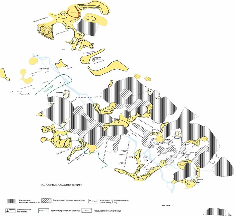 Условные обозначения: 1 – области первичного отсутствия отложений;