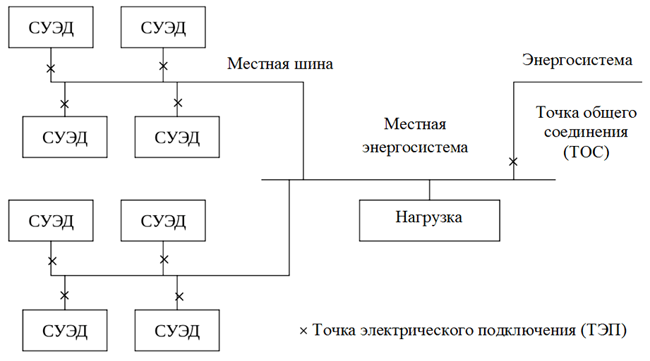 Местная шина интегрируется в региональную энергосистему в точке общего соединения. В этом случае каждая СУЭД имеет ТЭП при подключении к шине. На шине имеется ТЭП при подключении