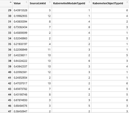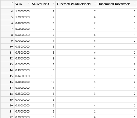 Столбец Value содержит рассчитанное значение значимой переменной. Столбцы SourceLinkId, KubernetesModuleTypeId и KubernetesObjectTypeId содержат значения переменных-предикторов.