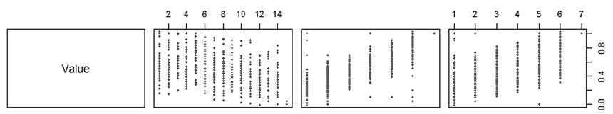 Для проверки линейной зависимости достаточно построить диаграмму рассеяния для каждой переменной-предиктора и переменной-ответа. Диаграмма рассеяния, построенная с помощью встроенных инструментов языка программирования R, представлена на рис. 3.