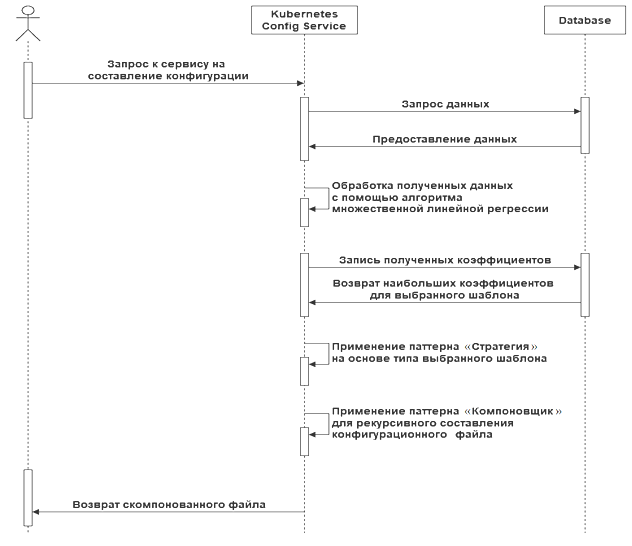 После выполнения алгоритма множественной линейной регрессии и обновления весовых коэффициентов на основе зависимой переменной из базы данных выбираются уникальные записи с самым большим коэффициентом для требуемого шаблона и передаются в сервис построения конфигурационных файлов Kubernetes. Данный сервис, применяя паттерн «Компоновщик» на основе входных записей требуемых объектов для данного шаблона, собирает конечный YAML-файл для дальнейшего его применения на Kubernetes кластере. Сервис реализован на языке C#. Схема работы реализованного сервиса представлена в виде диаграммы последовательности на рис. 7.