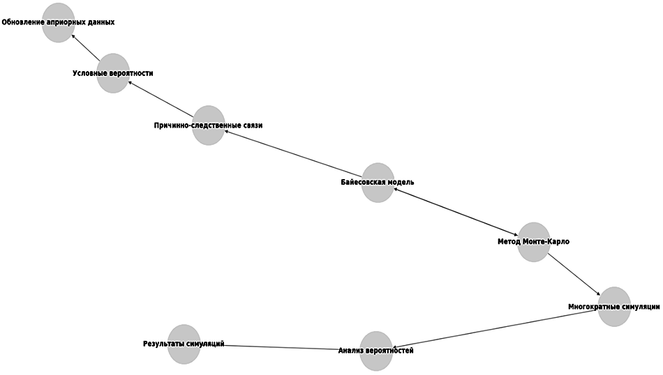 Граф демонстрирует, как байесовская модель создает причинно-следственные связи, а метод Монте-Карло используется для симуляций, анализа рисков и прогнозирования вероятностей. Взаимодействие этих методов позволяет эффективно обновлять вероятности в реальном времени, проводить анализ и разрабатывать стратегии для кибербезопасности.