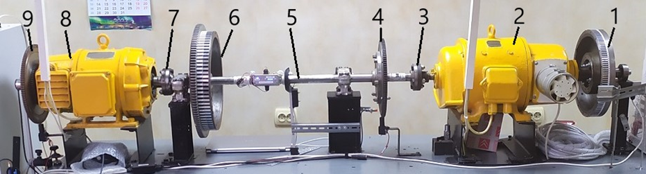 The direct current generator 8 simulates the operation of a propeller with the possibility of changing the magnitude of the braking torque. The measurement of torsional vibrations is possible using two small flywheels with toothed rings 4 and 9 located at both ends of the laboratory stand and one large measuring gear of the flywheel 6. The presence of a long shaft 4 and a large flywheel mass 6 allows stress measurement using strain gauges.