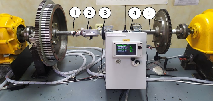 According to Fig. 2: 1 – load cell (Wheatstone bridge with strain gauge resistors 2FKP5-400 manufactured by Sibtenzopribor); 2 – autonomous unit for measuring load cells; 3 – wireless charging of the battery of the autonomous unit; 4 – central measuring unit; 5 – shaft of the laboratory installation.