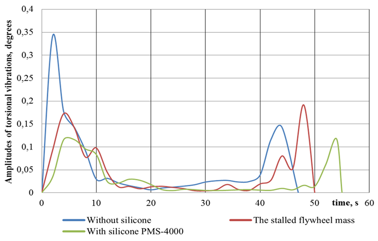 As a result, there was a significant decrease in amplitudes when using silicone liquid, as well as a change in the shape of the scalograms. Further, the authors calculated the dependences of the angular magnitude of torsional vibrations on the time of the experiment and on the rotation frequency.