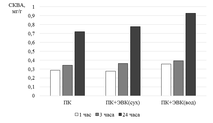 Наибольшее количество водорастворимых антиоксидантов во всех временных точках (1, 3 и 24 ч) было зарегистрировано в комбикорме с добавлением водного ЭВК (ПК + ЭВКвод): 0,356, 0,394 и 0,928 мг/г соответственно. Эти значения на 0,08, 0,03 и 0,15 мг/г выше, чем при использовании сухого экстракта (ПК + ЭВКсух). Более высокая антиоксидантная активность при водном нанесении экстракта на комбикорм может быть объяснена более равномерным распределением раствора ЭВК по всей поверхности гранул. Следует отметить, что удержание водорастворимых антиоксидантов было выше в первые 3 часа по сравнению с последующим периодом. С течением времени комбикорм набухает, что приводит к повышению растворимости и отдаче водорастворимых антиоксидантов во внешнюю среду.