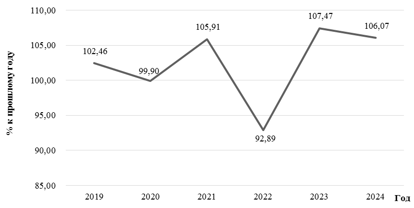 Значительная часть российской рыбной продукции предназначена для экспортных рынков, что делает отрасль чувствительной к динамике международной торговли. Россия входит в 5 стран-лидеров в мире по вылову водных биоресурсов, и ее рыбная продукция востребована на мировом рынке [10]. Влияние от ограничения международной рыночной деятельности России в 2022 г. четко прослеживается на графике (рис. 1), который отражает индекс промышленного производства, а именно переработку и консервирование рыбы, ракообразных и моллюсков [11]. Данное явление свидетельствует о том, что рыбная промышленность очень чувствительна к колебаниям рынка, которые могут иметь серьезные экономические последствия.