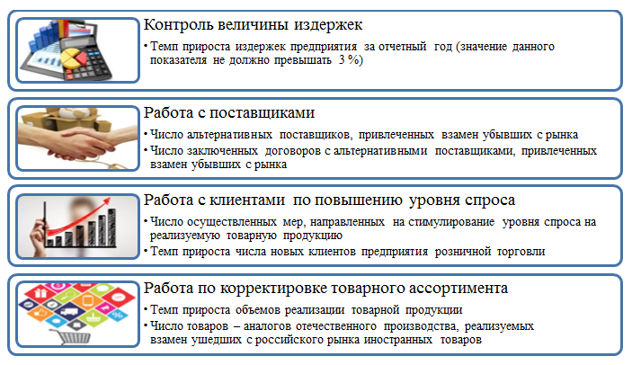 Каждое предприятие розничной торговли должно реализовывать комплекс мер, направленных на минимизацию последствий влияния внешнеэкономических санкций, т. к. реализуемые на государственном уровне меры (контрсанкции, меры государственной поддержки и т. д.) являются недостаточными для того, чтобы в полной мере поддержать деятельность конкретного предприятия.