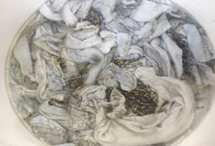 Рис. 2. Опытные партии образцов рыбьей кожи в различных соках (яблочный, томатный, тыквенный)