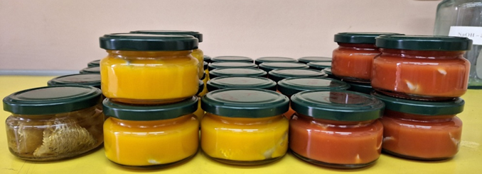 Fig. 2. Experimental batches of fish skin samples in different juices (apple, tomato, pumpkin)