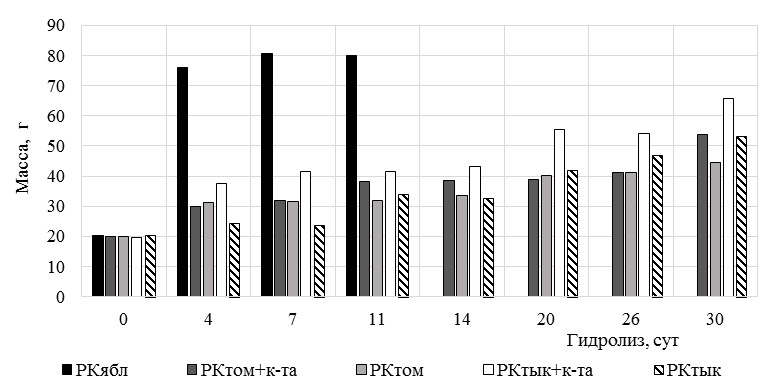Продолжительность гидролиза рыбьей кожи зависит от вида применяемого натурального сока (массовой доли, количества и вида органических кислот) и ряда других факторов (см. рис. 8). Очевидно, что яблочный сок, имеющий более высокое содержание органических кислот, способствует более значительному набуханию (и увеличению массы) рыбьей кожи (значительно уменьшая ее прочность) в течение менее продолжительного промежутка времени по сравнению с другими соками.