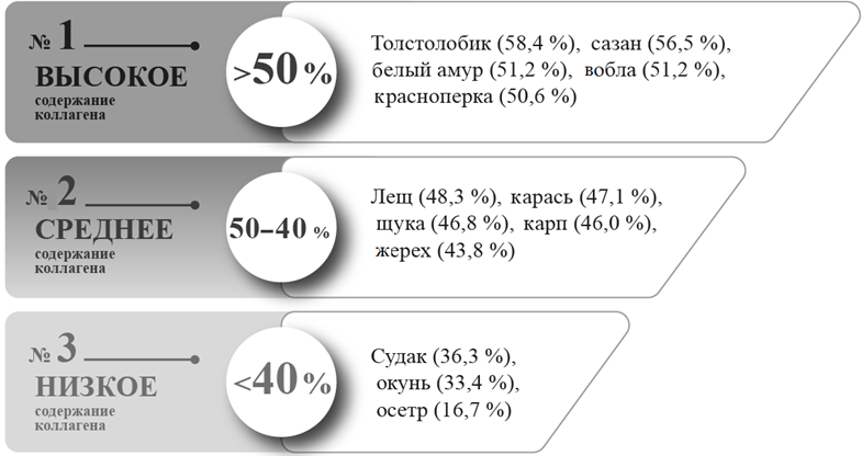 Таким образом, на основании исследований состава чешуи рыб предоставляется возможным провести ее классификацию по содержанию коллагена и условно разделить на 3 группы (рис.).