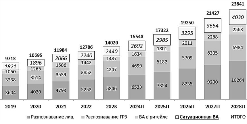 Рис. 1. Структура рынка видеоаналитики в России по видам, млн руб. [2]: П – прогноз