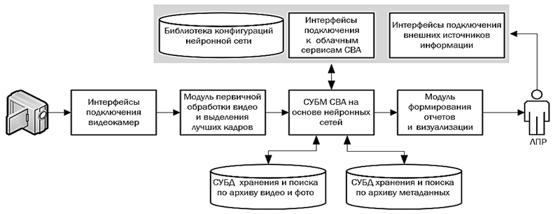 Системы поддержки принятия решений СВА предполагают, что окончательное решение на сцене видеонаблюдения должно приниматься лицом, принимающим решения (ЛПР). Системы поддержки принятия решений должны включать в себя классические компоненты: систему управления базами данных (СУБД), систему управления базой моделей (СУБМ) и интерфейс пользователя, обеспечивающие высокий уровень адаптивности и функциональности систем [11]. База данных является одним из ключевых элементов СППР, обеспечивая хранение и доступ к необходимой информации, она включает в себя внутренние данные (данные о текущих ситуациях видеонаблюдения – видеоаналитика online и видеоархив) и внешние данные (сведения из внешних источников). База моделей включает в себя математические модели, позволяющие проводить анализ ситуаций с использованием различных когнитивных алгоритмов для получения полезной информации, помогающей в принятии решений [12]. В качестве основного компонента баз моделей СППР СВА будем рассматривать нейронные сети. Это связано со способностью нейронных сетей эффективно обрабатывать большие объемы данных и выявлять сложные закономерности, что делает их актуальными для использования в различных системах СВА в современных условиях [13].