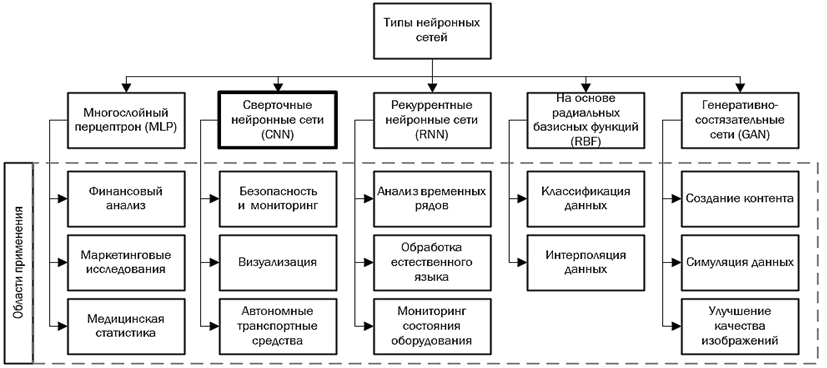 Классификация типов нейронных сетей и области их применения представлены на рис. 3 [14].