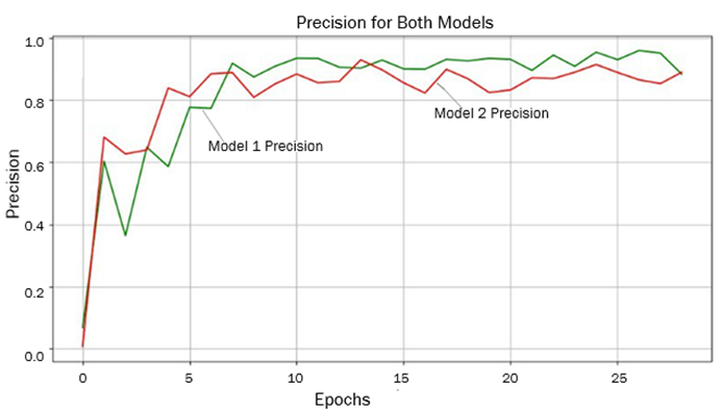 Обучение модели проводилось с помощью облачной платформы Colab.google, которая предоставляет необходимые мощности графической видеопамяти (GPU) и позволяет ускорить процесс обучения и достигнуть высокой точности при обучении модели нейронных сетей. Продолжительность обучения составила 26 часов и заняла 29 эпох. Каждая эпоха представляет собой полный проход по обучающему набору данных и перераспределение весов для обнаружения объекта СВА. Важно отметить, что после 28 эпохи началось переобучение модели, что проявилось в снижении точности на валидационных данных. Финальная модель достигла точности с показателем Precision = 95,2 %, расчеты проводились по формуле
