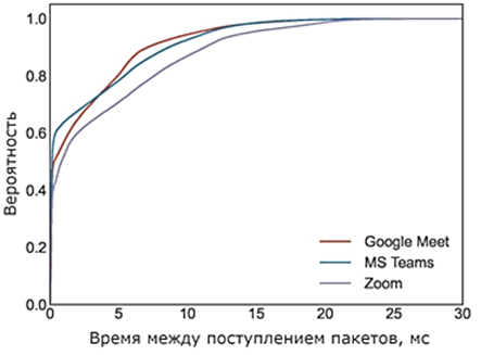 Рис. 2. CDF – интегральные функции распределения интервалов времени между поступлением пакетов