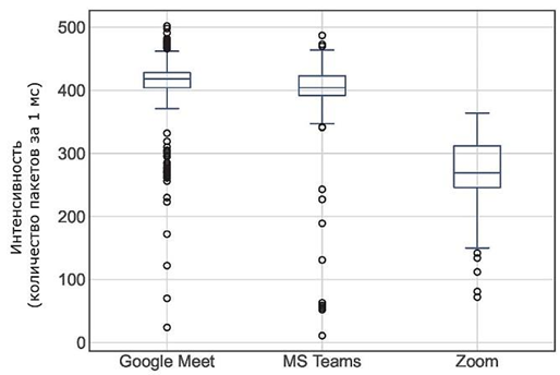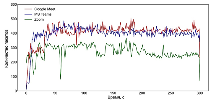 в течение суток последовательно для каждого приложения на двух стационарных терминалах (Samsung Galaxy A90 5G, с модемом Qualcomm Snapdragon X50 5G с установленной программой для анализа трафика PCAPdroid) без фонового трафика. Набор данных представляет собой видеотрафик (видеоконференции Google Meet, MS Teams и Zoom), оказывающий наибольшее влияние на планирование и управление сетью 5G.