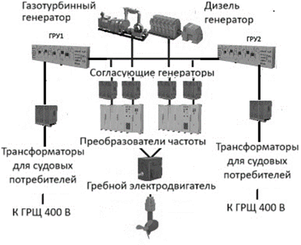 В общем виде структуры судовых пропульсивных систем могут быть представлены в виде набора модулей и вариантов построения схем электродвижения. Современные ведущие судопроизводители [4] предлагают различные варианты построения пропульсивных систем. Системы могут быть переменно-постоянными, переменного тока, постоянного тока, с активными преобразователями электроэнергии (выпрямители, инверторы), с реакторно-трансформаторным оборудованием. Так, к примеру, на рис. 2 приведены различные варианты структуры пропульсивной системы, реализуемые научно-произ-водственным центром «Судовые электротехнические системы» [4].