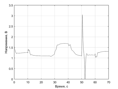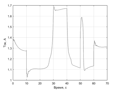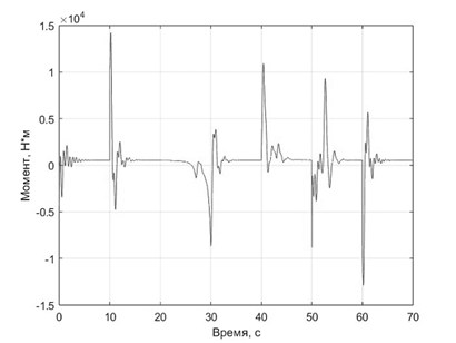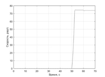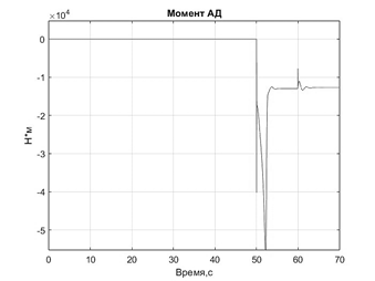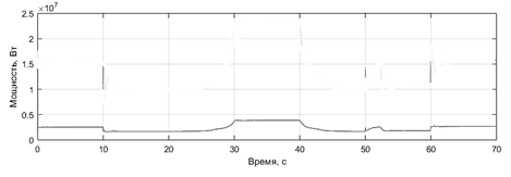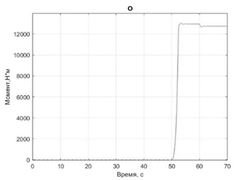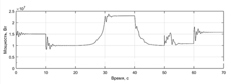 Ниже представлены результаты моделирования динамики пропульсивной системы. Моделирование возмущений (изменение момента на подруливающих устройствах) в системе задавалось по следующей схеме: вначале подключаемая нагрузка отключена; на 20-й секунде увеличивается момент в системе электродвижения; на 30-й секунде – «полный вперед»; на 40-й секунде обороты двигателя снижаются; на 50-й секунде происходит запуск носовых подруливающих устройств; на 60-й секунде подключается дополнительная нагрузка.