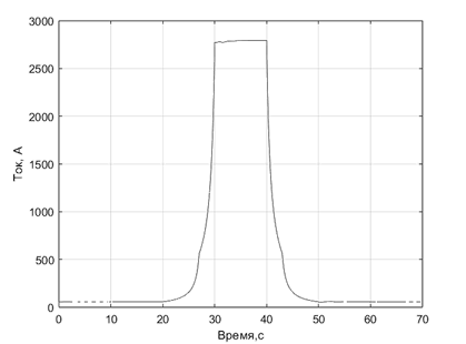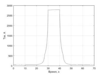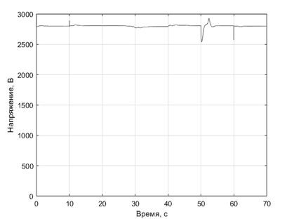 На рис. 12, 13 представлена динамика двухполупериодного шестипульсного выпрямителя со средним значением. Мощность выпрямителя на стороне переменного тока равна сумме фиксированных потерь мощности и выходной мощности выпрямителя на стороне постоянного тока. Показаны токи и напряжения постоянной части выпрямителя. Ток резко увеличивается, начиная с момента включения двигателя, и при команде «полный вперед» с 30-й по 40-ю секунду остается почти постоянным. Также видно мгновенное падение напряжения при включении остальных потребителей на 60-й секунде мощностью 6 кВт.