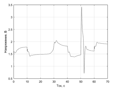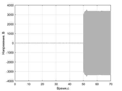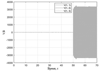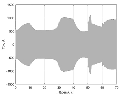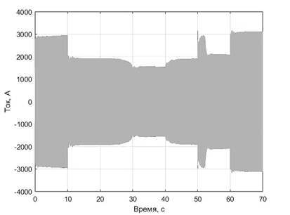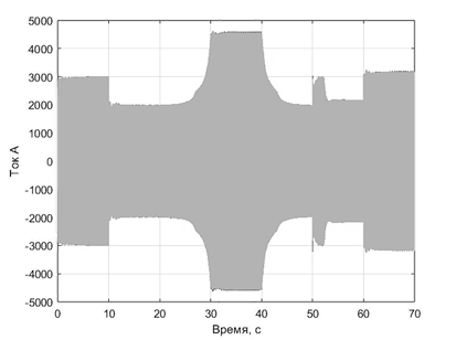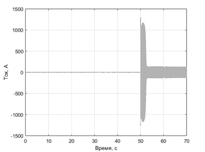 Данные режимы являются наиболее сложными и требуют повышенного внимания при моделировании и исследовании процессов в системе. На рис. 11 показан график изменения фазных токов и напряжений на статоре асинхронного двигателя, вызванного сложным характером нагрузки внешних сил на подруливающие устройства, которая подключается на 50-й секунде. Переходный процесс протекает почти 10 секунд, и на 60-й секунде происходит скачок напряжения и тока в связи с включением остальных потребителей.