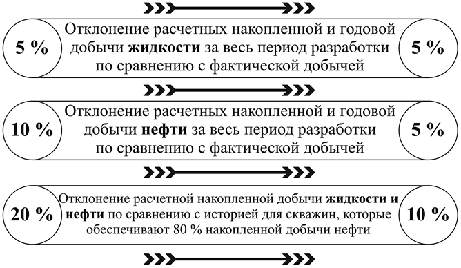 Далее в рамках составления проектного документа на разработку месторождения (ПТД) в процессе адаптации ГДМ на фактические показатели разработки месторождения расхождение расчетных данных с фактическими также удовлетворяли регламентным требованиям Центральной комиссии по согласованию технических проектов разработки месторождений углеводородного сырья (ЦКР Роснедр по УВС), а именно отклонение расчетных накопленной и годовой добычи жидкости и нефти по каждому эксплуатационному объекту за весь период разработки не превышает 5 и 10 % соответственно по сравнению с фактической добычей, а отклонение расчетной накопленной добычи жидкости и нефти не должно превышать 20 % по сравнению с историческими показателями для скважин, которые обеспечивают 80 % накопленной добычи нефти объекта [7].