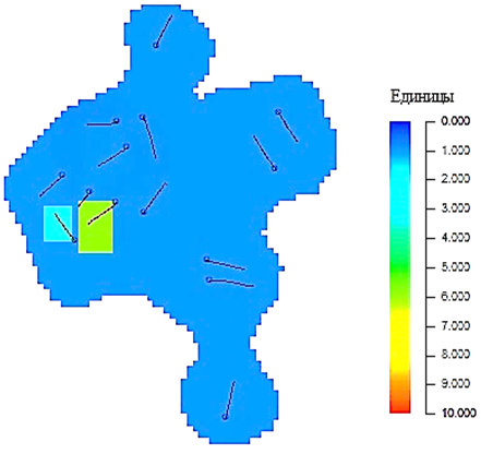 Только при использовании в ГДМ множителей на поровый объем получен приемлемый результат по сходимости показателей добычи. Таким образом, были определены зоны необходимости локального пересмотра распределения коллекторов ниже горизонтальных участков стволов с целью возможного увеличения обеспеченностью геологическими запасами в зоне дренирования скважин. По результатам адаптации ГДМ рекомендуемые зоны увеличения порового объема, полученные при адаптации гидродинамической модели, представлены на рис. 2. Возникла необходимость пересмотра геологической основы месторождения.
