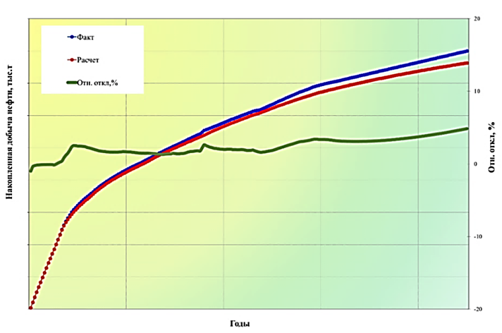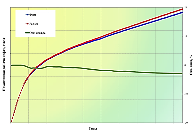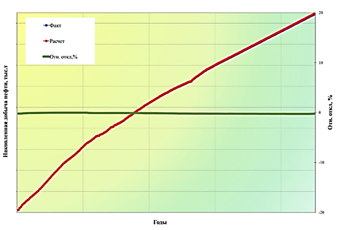 Fig. 6. Convergence of accumulated oil production based on the history of well operation No. 2 with calculated HDM data (2023, discrepancy less than 1%)