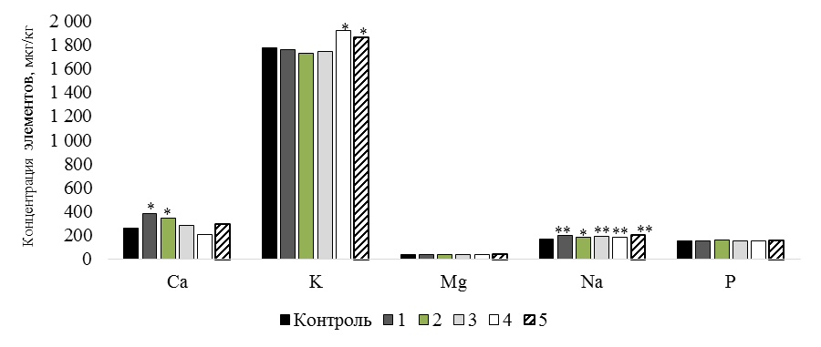 Натрий, кальций и калий являются жизненно важными макроэлементами. При изучении концентрации макроэлементов (см. рис. 2) установлено, что содержание Na во всех группах увеличивалось. Так, в 5 группе зафиксировано наибольшее повышение (на 19,4 % (Р £ 0,01)) по сравнению с контролем. В других группах концентрация Na повышалась от 8,2 % (Р £ 0,05) до 15,3 % (Р £ 0,01). Натрий регулирует количество воды во внеклеточном пространстве посредством осмотических гомеостатических процессов и совместно с K регулирует общее количество воды в организме. Кроме того, K вносит значительный вклад во внутриклеточную осмолярность и играет важную роль в деятельности нервной системы [13]. Повышение концентрации K было зафиксировано в 4 группе на 8,5 % (Р £ 0,05) и в 5 группе – на 5,2 % (Р £ 0,05).