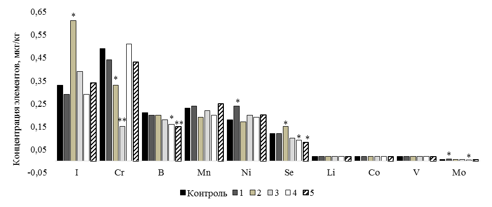 differences with the control in * P ≤ 0.05; ** P ≤ 0.01: а – I, Сr, B, Mn, Ni, Se, Li, Co, V, Mo; б – Si, Zn, Fe, Cu