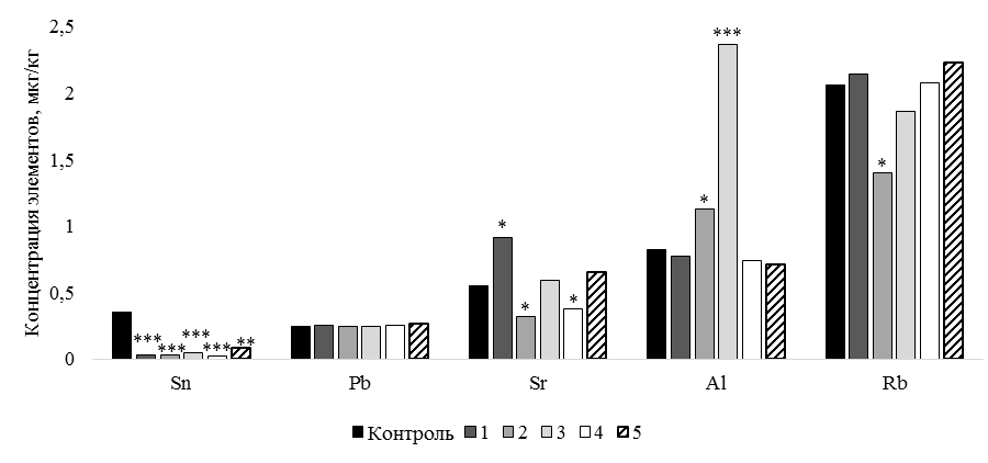 Наиболее отличительные результаты были получены в 1 группе, которая дополнительно с основным рационом получала ванилин. Так, ванилин способствовал повышению концентрации жизненно необходимых элементов – Ca, K, Fe, Ni, в то же время снижая содержание Sb и Sn.