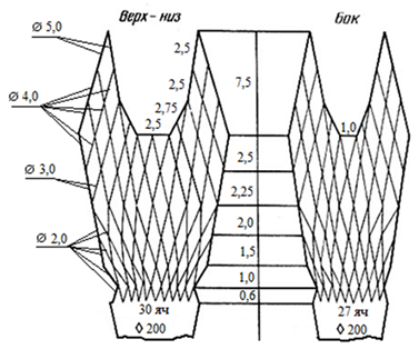 Для определения раскрытия ячеи по чертежам разноглубинного трала 18/95 м были изготовлены две модели четырехпластных мешков с различной ориентацией дели Т0, Т90: с шагом ячеи a = 8,0 мм и диаметром нити d = 1,0 мм, количеством ячей по высоте ТМ m = 200 шт. и его длине n = 320 шт. (рис. 2) [8].