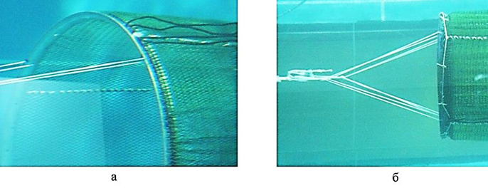 Рис. 3. Посадка тралового мешка на обручи D2 = 540 мм (а) и D1 = 350 мм (б)