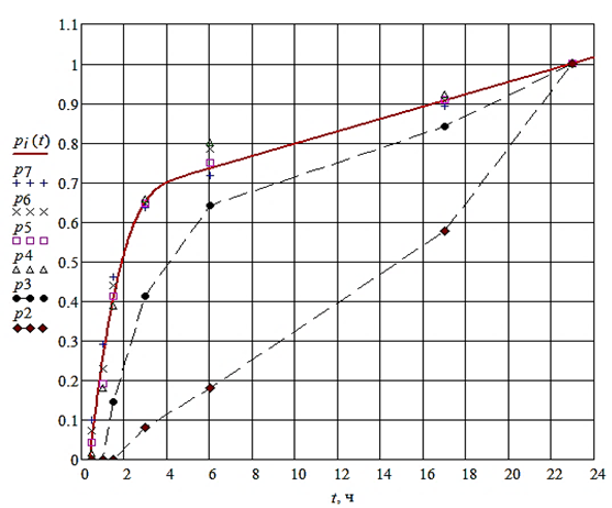 Заметим, что начиная с массовой доли 4 % и больше (р4–р7), разброс точек невелик (представлен усреднено в виде графика pi(t)), поэтому изменение значений для данных образцов по времени можно описать функцией, для t ≤ 5 ч кубической, для t > 5 ч – линейной: