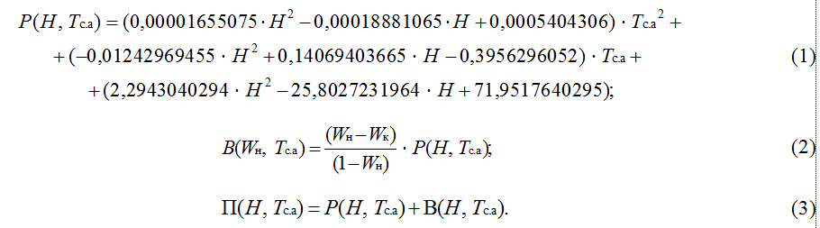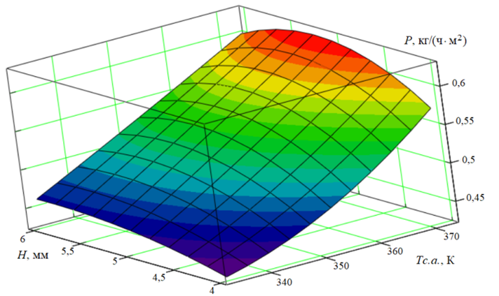 Для оптимизации процесса сушки рыборастительного фарша, опираясь на результаты исследований [6–9], в качестве критерия оптимизации была выбрана удельная производительность сушильной установки по сухому продукту (P). Этот показатель отражает массу готового продукта с влажностью 0,05 кг/кг, получаемую с единицы площади рабочей поверхности за час:
