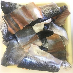 with fins, scales and cuts of meat (a) and salmon skin with scales and cuts of meat (б)