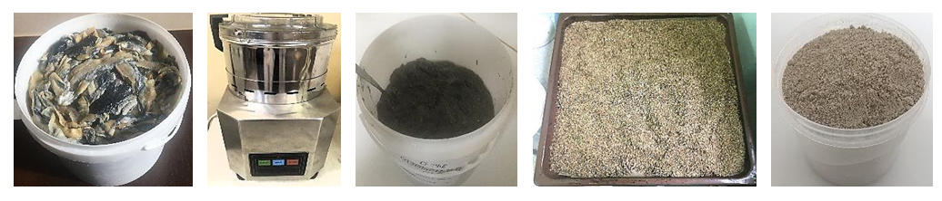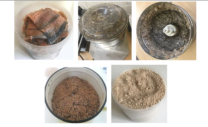 Процесс получения опытных образцов растительно-рыбных пищевых добавок осуществляли следующим образом. Соленое рыбное сырье размораживали при комнатной температуре до –1 ºС и порциями загружали в куттер (емкость 3 л, 1 400 об/мин, Fama FCU 102 kutter, Италия) и обрабатывали в течение 60–90 с. Полученную массу в виде пасты с неизмельченной чешуей порциями загружали вместе с крупой пшеничной в определенных массовых соотношениях в ножевой смеситель (Moulinex Delico FP203, 500 Вт) и обрабатывали в течение 30 с. Полученную смесь далее обезвоживали (электросушилка Clatronic DR 275) при помощи теплого воздуха (40 ºС) до содержания массовой доли влаги не более 12 % и измельчали в высокоскоростном мультифункциональном измельчителе (чаша 0,8 л, 36 000 об/мин, 3 000 Вт, производитель Zhejiang Winki Plastic Co., Ltd., Китай) в течение 20–30 с, до состояния муки (размер частиц до 600 мкм). Процесс получения опытных образцов пищевых добавок представлен на рис. 2, 3.