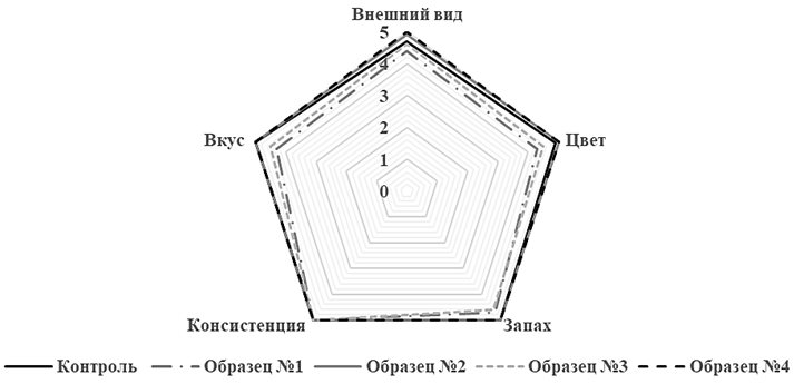 Рис. 6. Органолептический профиль контрольного и опытных образцов блинов