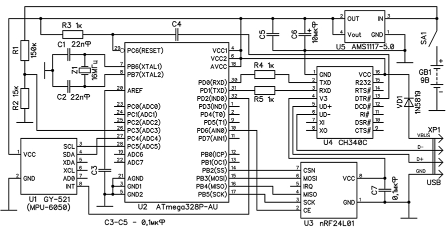 В качестве инерциального сенсора в разработанном устройстве использован модуль GY-521 с установленным на нем микроэлектромеханическим датчиком MPU-6050 от компании InvenSense, содержащим трехосевой акселерометр, трехосевой гироскоп, термодатчик и специализированный цифровой сигнальный процессор – Digital Motion Processor (DMP). Как было сказано ранее, MPU-6050 весьма часто используется в системах для анализа походки человека. Акселерометр измеряет ускорения вдоль трех перпендикулярных осей, а гироскоп – угловые скорости вокруг этих осей. Для определения угловых координат расположения сенсора можно использовать как гироскоп, так и акселерометр по отдельности, однако данные с акселерометра содержат шум и могут быть некорректными при быстром линейном перемещении. При измерении углов с помощью гироскопа наблюдается постоянный дрейф его показаний даже в состоянии покоя. Для более надежного определения положения сенсора чаще всего используют способы фильтрации, использующие одновременно данные гироскопа и акселерометра [30]. Имеющийся в датчике MPU-6050 цифровой сигнальный процессор DMP предназначен, в том числе, и для такой фильтрации. Угол поворота датчика вокруг вертикальной оси, вдоль которой действует сила тяжести, может быть определен только по показаниям гироскопа. В этом случае его может помочь определить магнитометр, имеющийся в MPU-9250, однако в этом нет необходимости, поскольку в используемой плоской пятизвенной модели поворот вокруг вертикальной оси не учитывается. Передача данных с датчика на микроконтроллер осуществляется по шине I2C. Полученные с каждого датчика данные в большинстве исследований передаются на персональный компьютер по беспроводному каналу. В работах [13, 18] все измерительные модули, размещенные на теле человека, соединены проводами c центральным модулем, и затем собранные данные сохраняются на флеш-накопитель [13] либо передаются по Bluetooth [18] на ПК, в остальных рассмотренных работах данные передавались на компьютер непосредственно с каждого измерительного модуля. В исследованиях [14, 15, 17] для передачи данных использовался интерфейс Bluetooth, в [16, 20, 22, 26] – Wi-Fi, а в [11] – модуль nRF24L01, передающий данные на частотах 2 400–2 527 МГц. В данной работе использован модуль nRF24L01, потребляющий наименьший ток по сравнению с HC-05 (Bluetooth) и ESP-01 (Wi-Fi), что важно, поскольку инерциальные модули питаются от автономного источника питания. На рис. 2 показана принципиальная электрическая схема инерциального измерительного модуля.