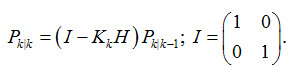 где H – модель наблюдения, отображающая истинное пространство в наблюдаемое, определяемая как H = (1 0), поскольку под измерением понимается угол, измеренный с помощью акселерометра; zk – результат измерения. Затем вычисляется матрица коэффициентов усиления Калмана: