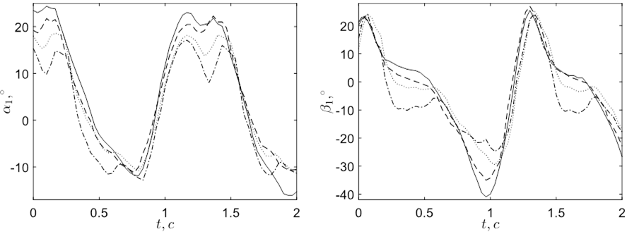 С помощью разработанных носимых сенсоров получены зависимости φ(t), α1(t), α2(t), β1(t), β2(t) для 4 экземпляров походки одного человека, идущего прямолинейно по ровной поверхности (рис. 5).