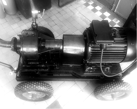 Установка разработана на основе известной и широко распространенной конструкции роторно-пульсационного аппарата (РПА) [8]. Для преодоления кавитационного барьера внутри корпуса РПА дополнительно установлены две центробежные ступени. Фотография опытной экспериментальной установки приведена на рис. 1.