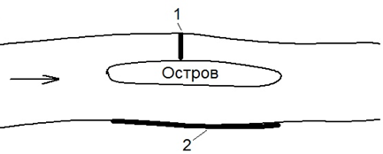 1, 2 – полузапруды, отсекающие затонную часть; 3, 4 – полузапруды на нижней косе;