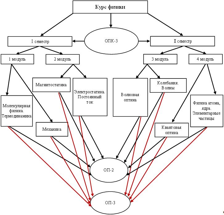 Следует различать понятия «кадр обучающей программы» и «шаг процесса усвоения». Так, величина одного шага процесса усвоения – это процесс усвоения элемента знаний, управление которым должно основываться на соответствующих психологических закономерностях мышления человека [5]. Значит, в каждом кадре ОП может быть один и более шагов процесса усвоения, что оказывает влияние на плотность ОП. Кроме того, плотность, исходя из сложности обучающей программы, будет различной для разных обучаемых, имеющих неодинаковый начальный уровень знаний по физике. Структура курса физики по семестрам представлена в виде четырех модулей, необходимых для реализации общепрофессиональной компетенции (ОПК-3), которой должен овладеть студент в результате освоения программы бакалавриата по данной дисциплине (рис. 1).