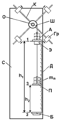 1. Вращая маятник рукой, намотать нить на шкив большего или малого диаметра d, чтобы груз m достиг выбранного положения h1 (рис. 2). Нажать кнопку «Пуск». При этом отключится тормозное устройство, удерживающее маятник, и включится секундомер.